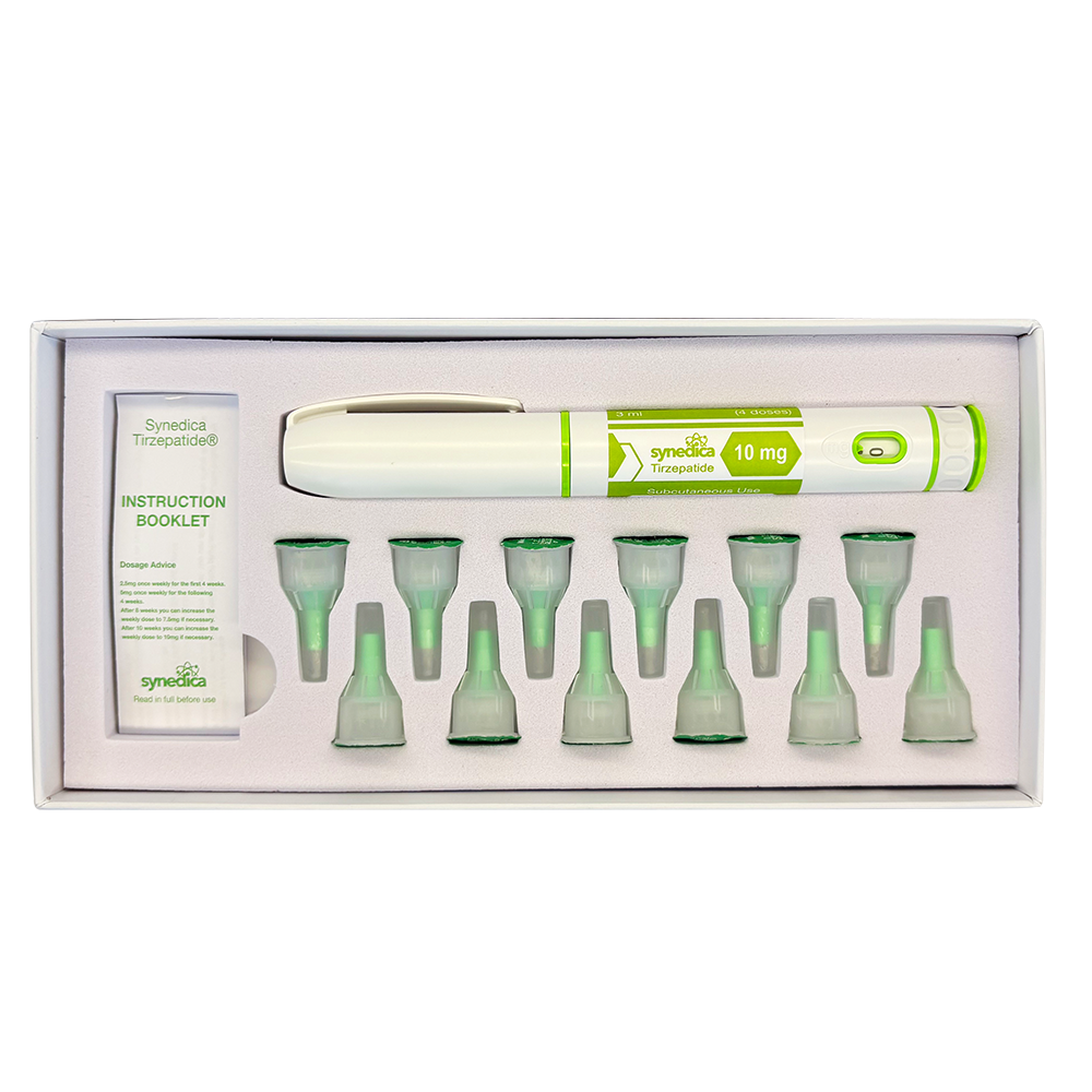 The Synedica Tirzepatide® Injection Pen Kit is one of the most advanced medical weight loss treatments available. Commonly known as Mounjaro, tirzepatide acts on two key hormone pathways—GLP-1 and GIP—to suppress appetite, making you feel satisfied after smaller meals. This dual action helps users achieve significant, sustainable weight loss. One kit typically lasts 12 weeks for new patients.